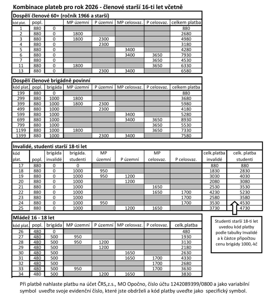Každý člen je povinen do 30.4. 2026 uhradit celkový členský příspěvek dle §3, odst.7 stanov ČRS, jak je uvedeno v kombinacích plateb pro rok 2026!! Výbor ČRS, z.s., MO Opočno doporučuje svým členům zaplatit členský příspěvek do 28.2.2026. V případě pozdní platby je takový člen posuzován jako člen nový a vztahuje se na něho povinnost platit zápisné. Každý nový člen nad 16 let včetně zaplatí zápisné 700,- Kč.